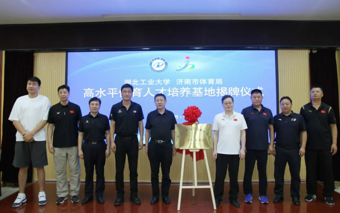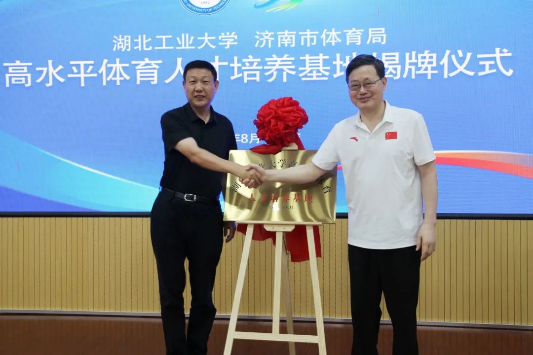 在热烈的掌声中,孔杰、龚发云共同为“湖北工业大学高水平体育人才培养基地”揭牌。