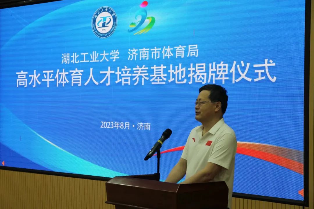 龚发云在致辞中介绍了湖北工业大学及其体育学院培养目标、学科建设、专业设置、教学成果等相关情况,感谢济南市体育局对湖北工业大学的大力支持。龚发云表示,济南市球类运动中心培养、输送了多名优秀的篮球专业人才助力湖北工业大学在湖北乃至全国重大赛事中斩获佳绩,因此,湖北工业大学将“高水平体育人才培养基地”落户济南市球类运动中心。他希望以此次共建为契机,双方在人才培养、项目研究等方面有更广领域、更深层次的合作,共同推动体育事业蓬勃发展。