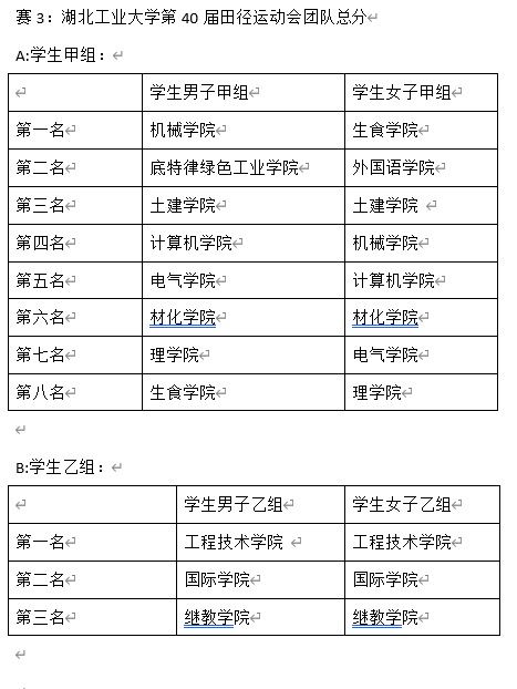 据悉,本届田径运动会比赛分广播体操比赛、体质测试大比武、田径比赛三个单元板块依次进行,比赛精彩纷呈、环环相扣、高潮不断。田径比赛板块竞赛项目共设14项,含拔河、跳绳、异程接力3大团体项目,学生组1113人次,教工组681人次,共2500人次参赛。据不完全统计,广播比赛、体质测试大比武、田径比赛三大板块得参赛人数,加上开、闭幕式及运动会相关人员人数高达16000人次以上,创历史新高。本届田径运动会提出“强健体魄、湖工筑梦、不负韶华、青春飞扬”的办赛宗旨基本达成,校园体育文化氛围持续高涨,取得体育竞赛和精神文化双丰收。