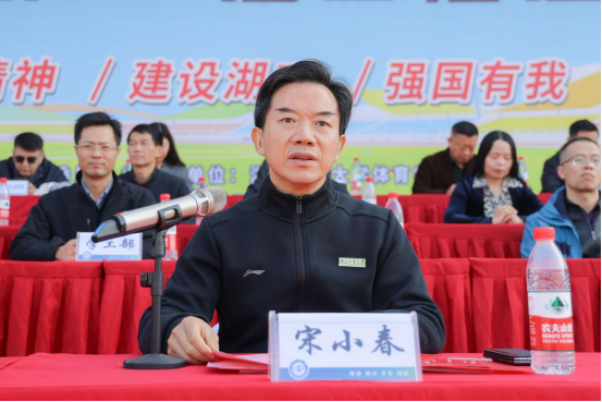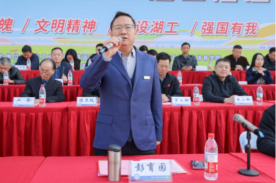 校长宋小春致开幕辞。他首先代表学校向运动会的召开表示热烈祝贺,向积极备战的运动员、辛勤工作的裁判员、教练员、志愿者及全体工作人员致以诚挚的问候和衷心的感谢。宋校长指出,学校始终牢记为党育人、为国育才的初心使命,坚持“健康第一”的教育理念,将体育作为立德树人的重要载体。他特别点赞了近年来湖工健儿在国内外赛场的卓越表现:从陈俊崧在世界大学生运动会上为国争光,到校乒乓球队、男篮、男足在多项顶级赛事中屡获佳绩,充分彰显了湖工人“昂扬向上、顽强拼搏”的体育精神。宋校长强调,本届运动会创新设置了“旱地龙舟”、“乾坤螺旋球”等特色集体项目,旨在让广大师生在竞技中“享受乐趣、增强体质、健全人格、锤炼意志”,希望将赛场上激发出的团结与奋斗精神,转化为推动学校事业发展的强大合力。