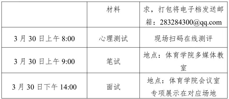 1.综合面试。对考生的思想政治素质和品德、专业素质和能力、 综合素养及身心状况方面等进行考察。考生在此环节还需进行运动专项展示,考生根据个人专业特长,准备一项运动技能展示,要求在展 示的同时进行必要讲解。运动专项展示涉及到的场地、器材等,请提 前与我院联系准备。